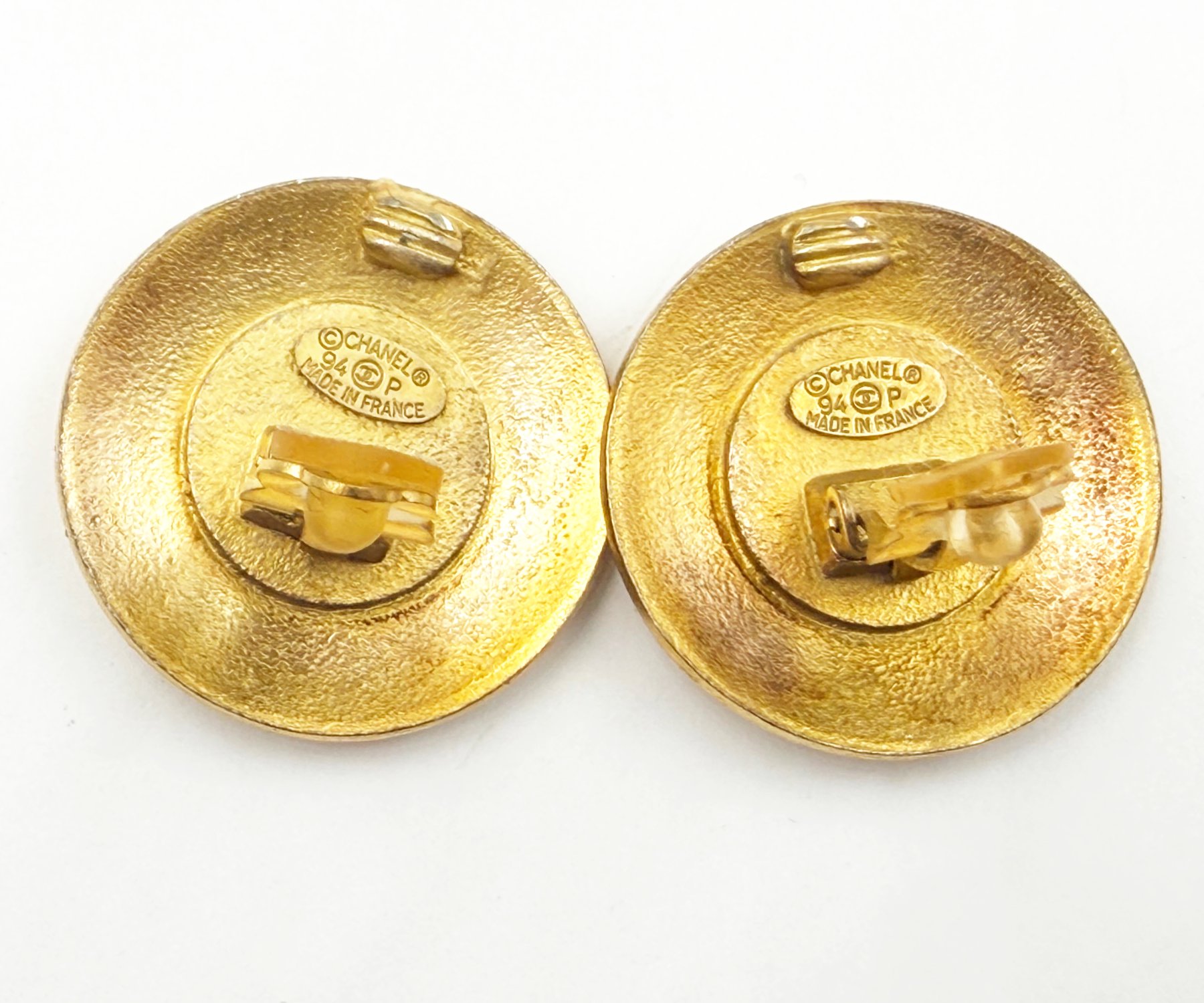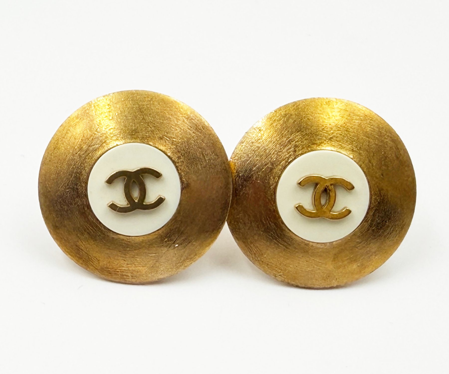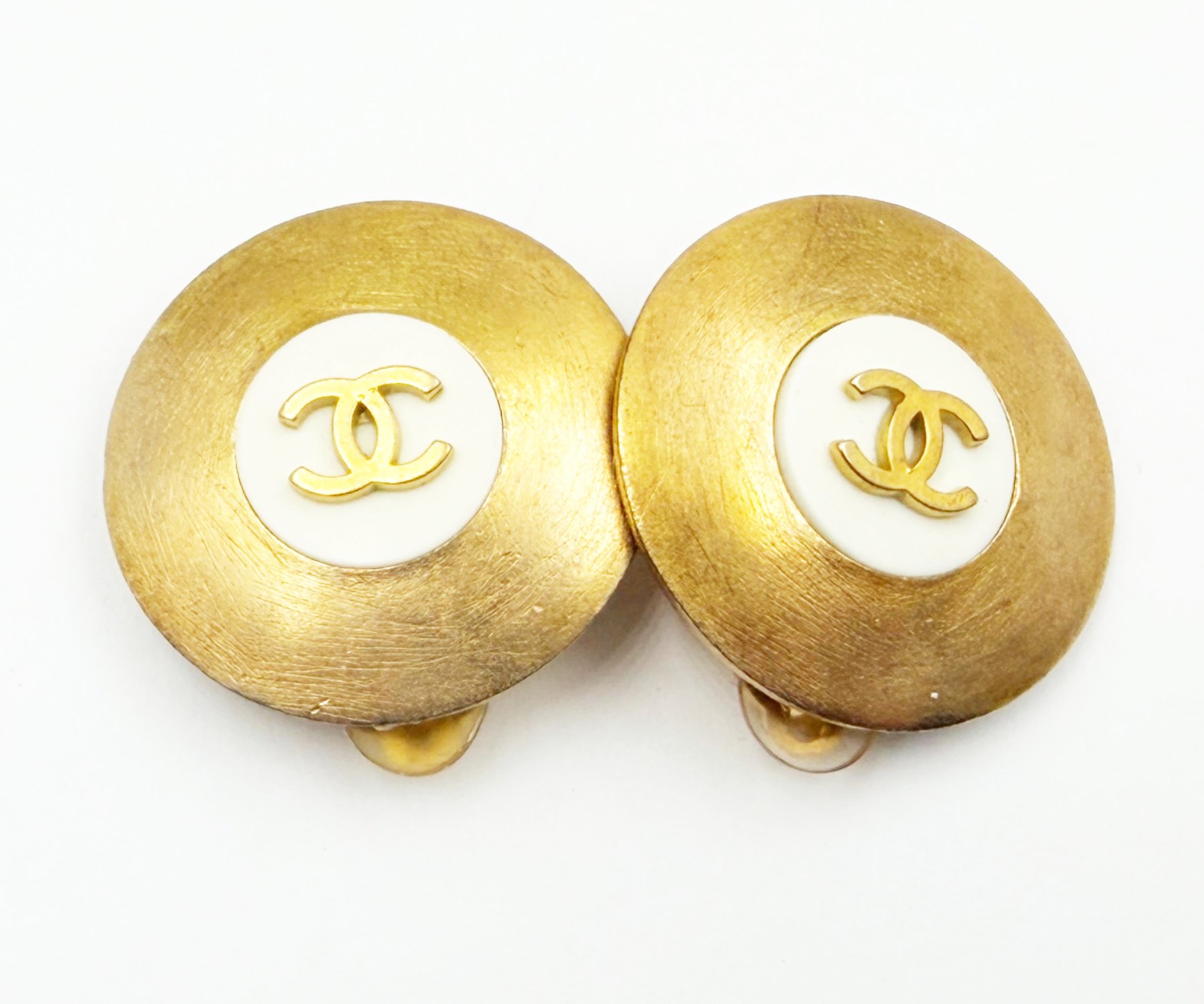 Chanel Vintage Gold Plated CC White Disc Clip On Earrings