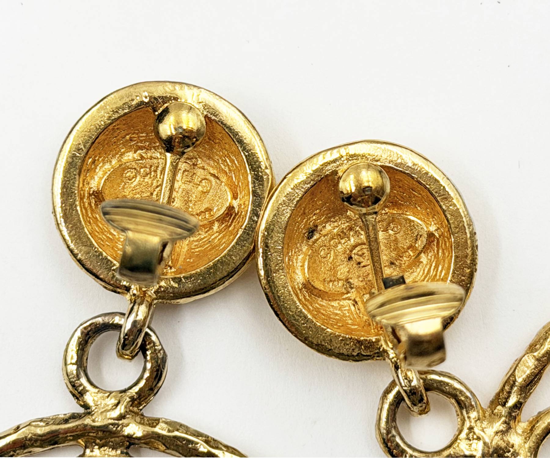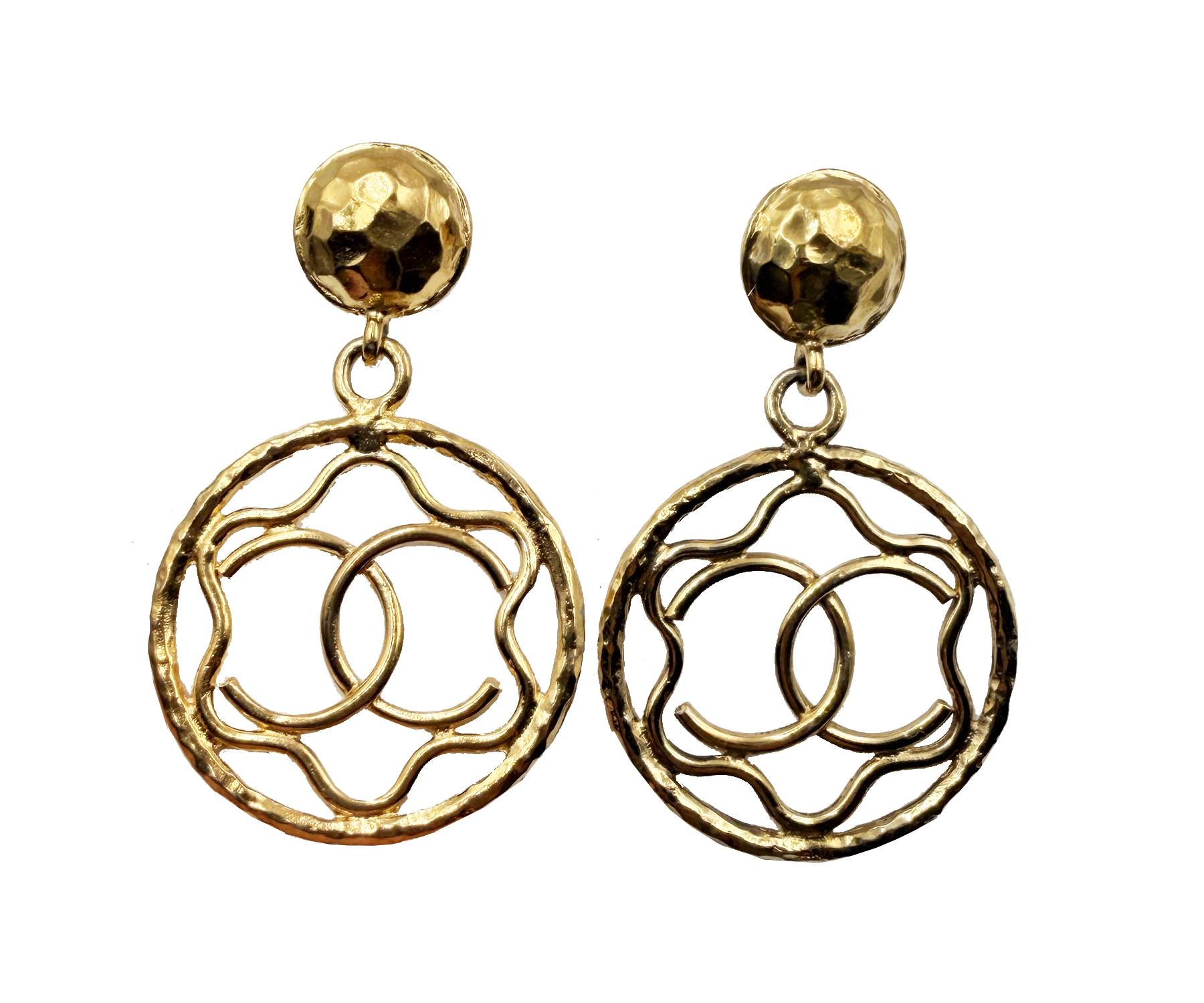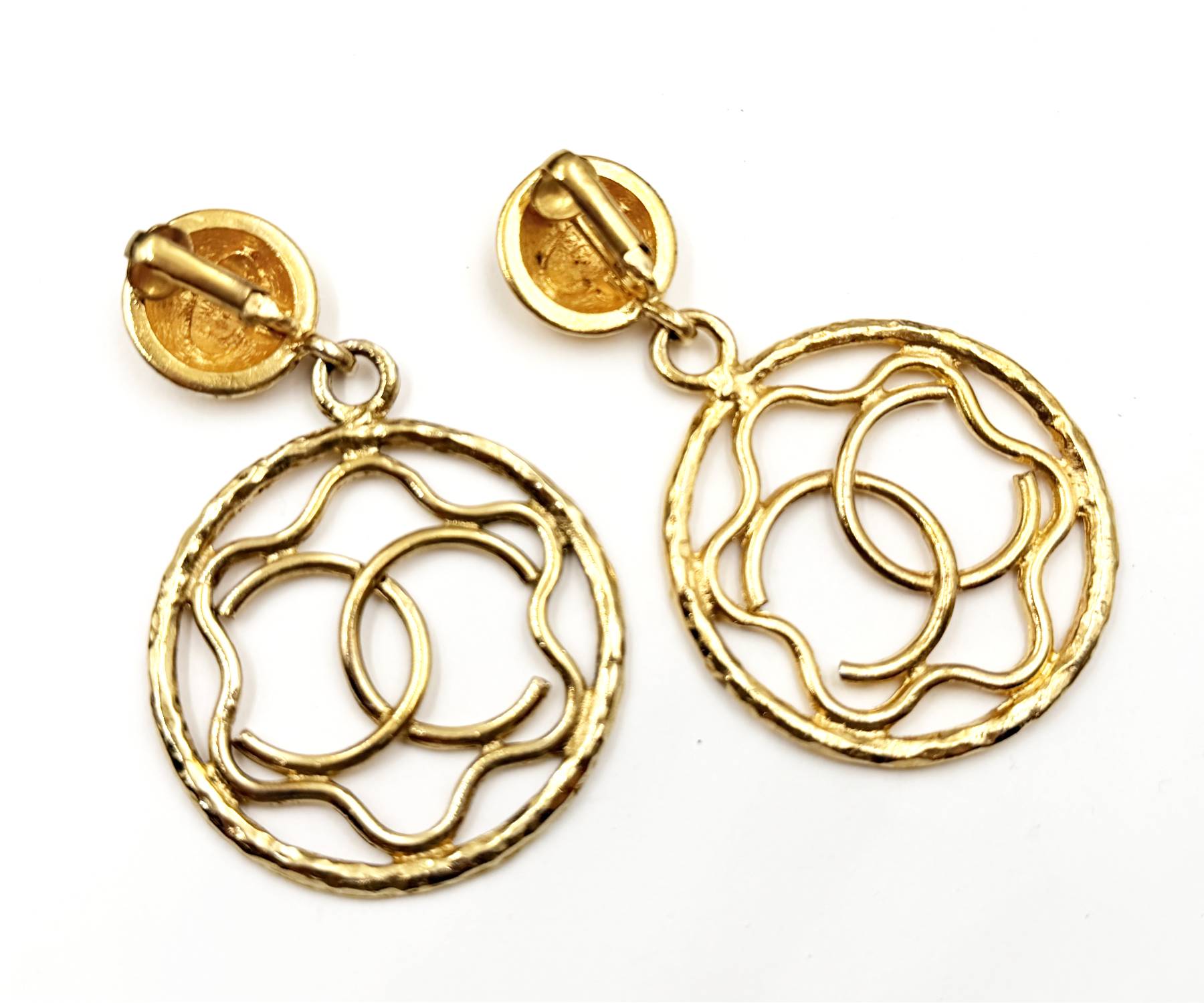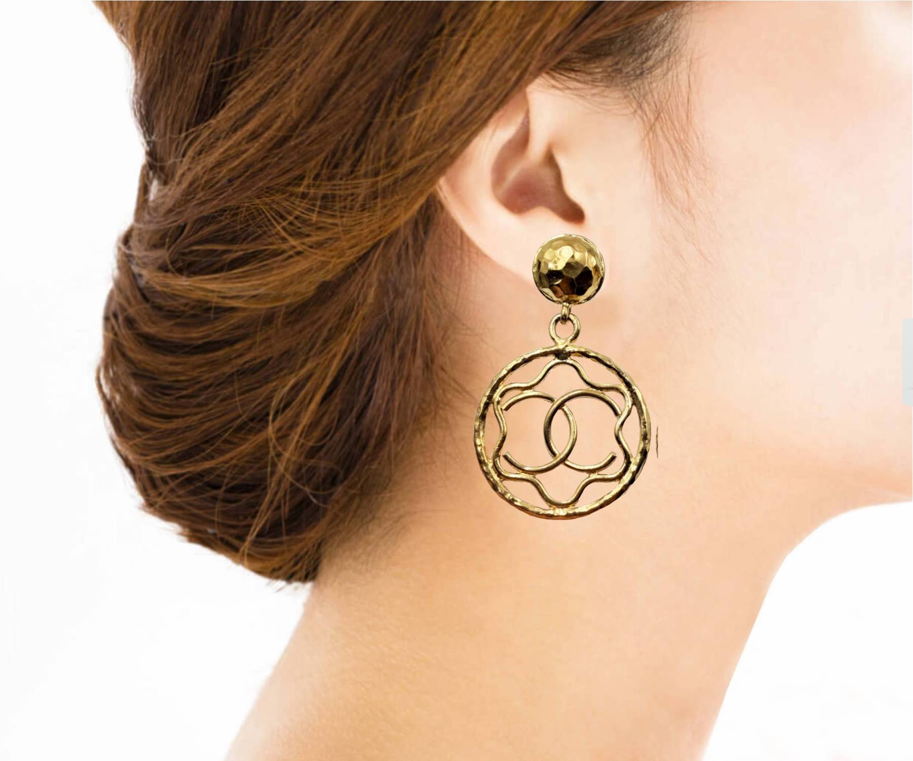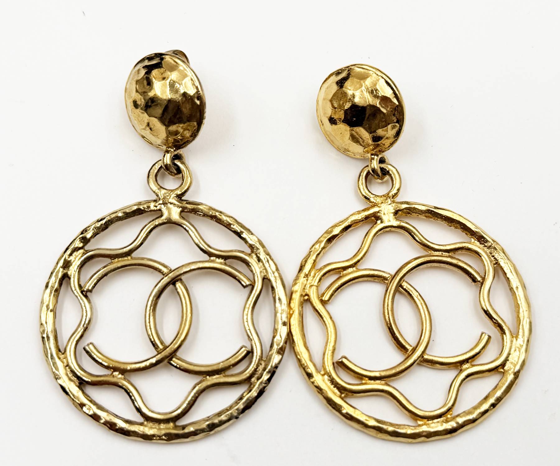 Chanel Vintage Gold Plated Hammered Round Ruffle CC Large Dangle Clip on Earrings