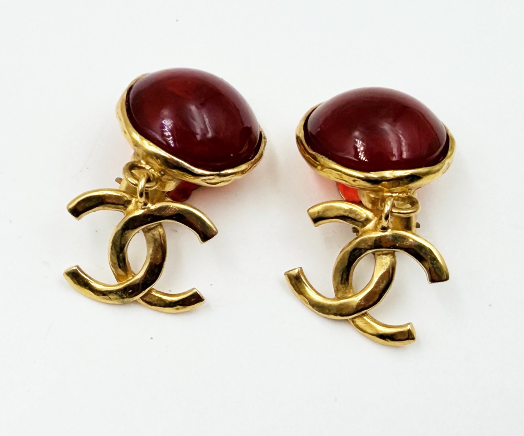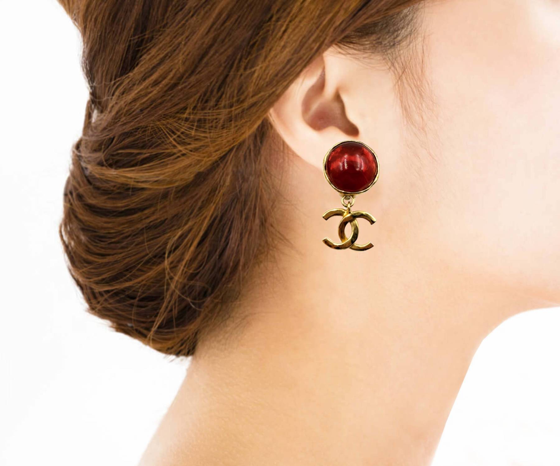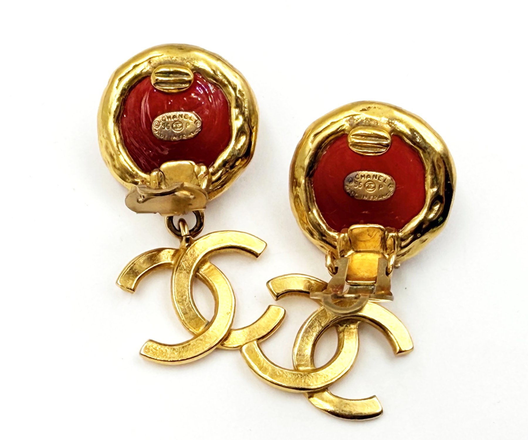 Chanel Vintage Gold Plated Red Stone CC Dangle Clip on Earrings
