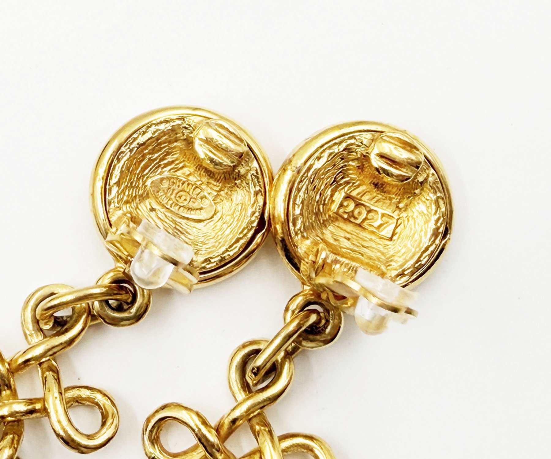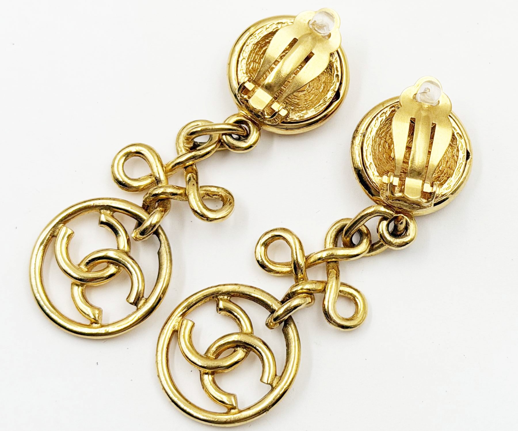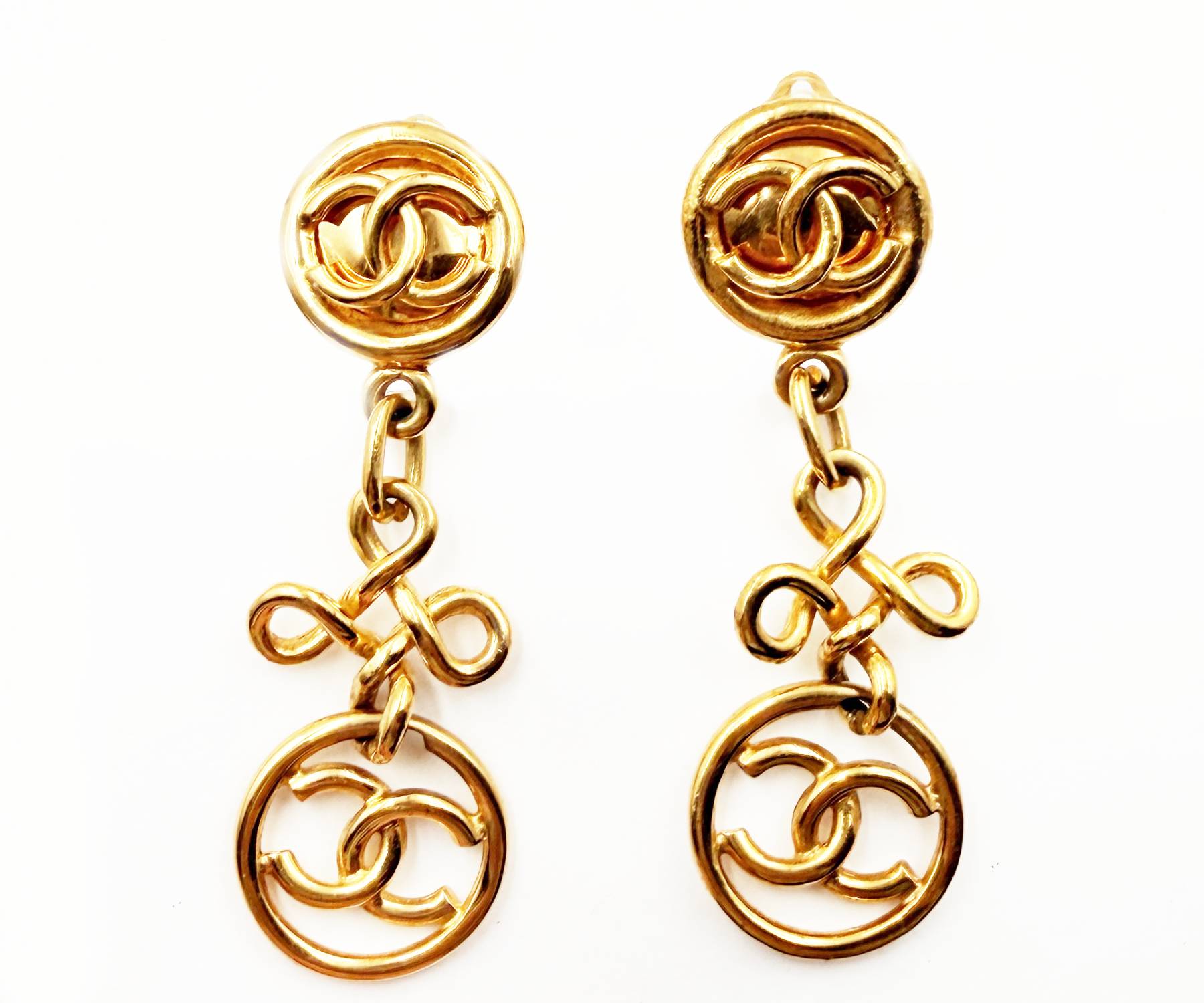 Chanel Vintage Gold Plated Round CC Twisted Cross Long Clip on Earrings
