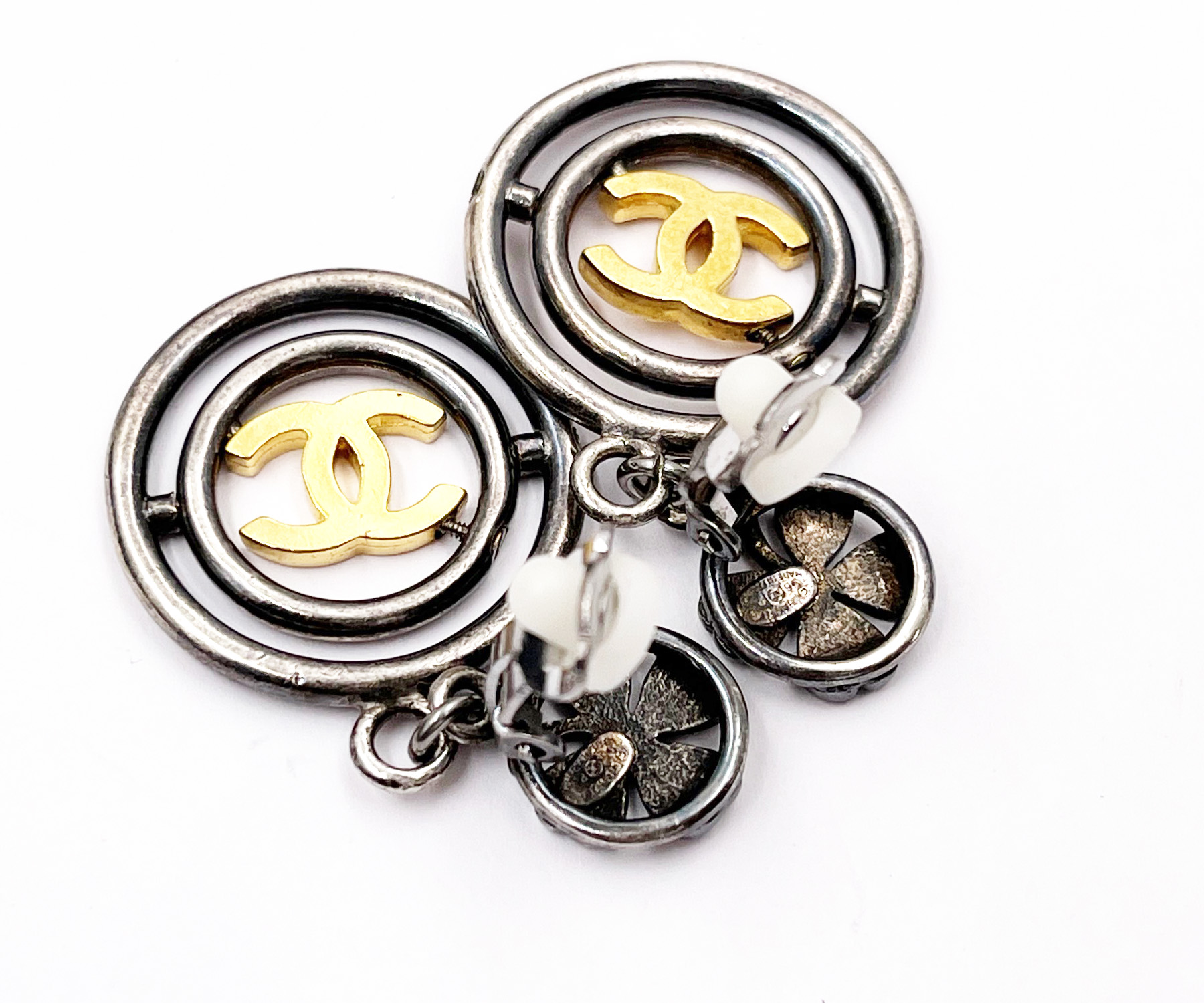 Chanel Vintage Rare Gunmetal Round Clove Gold Spinning CC Clip on Earrings