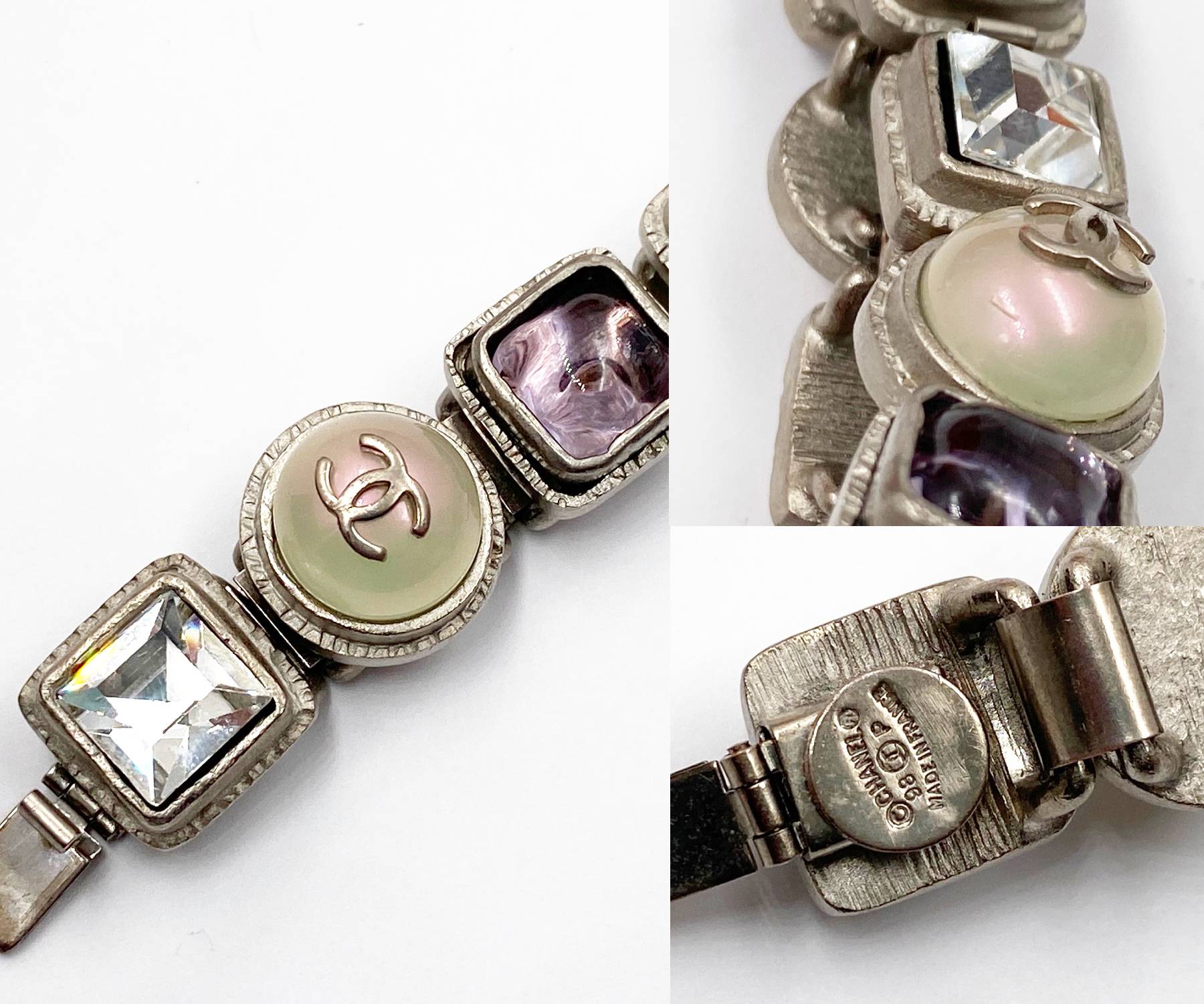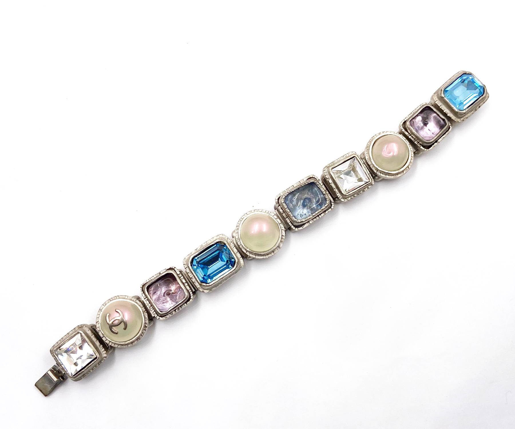 Chanel Vintage Rare Rustic Silver Gem Stone Pearl CC Bracelet
