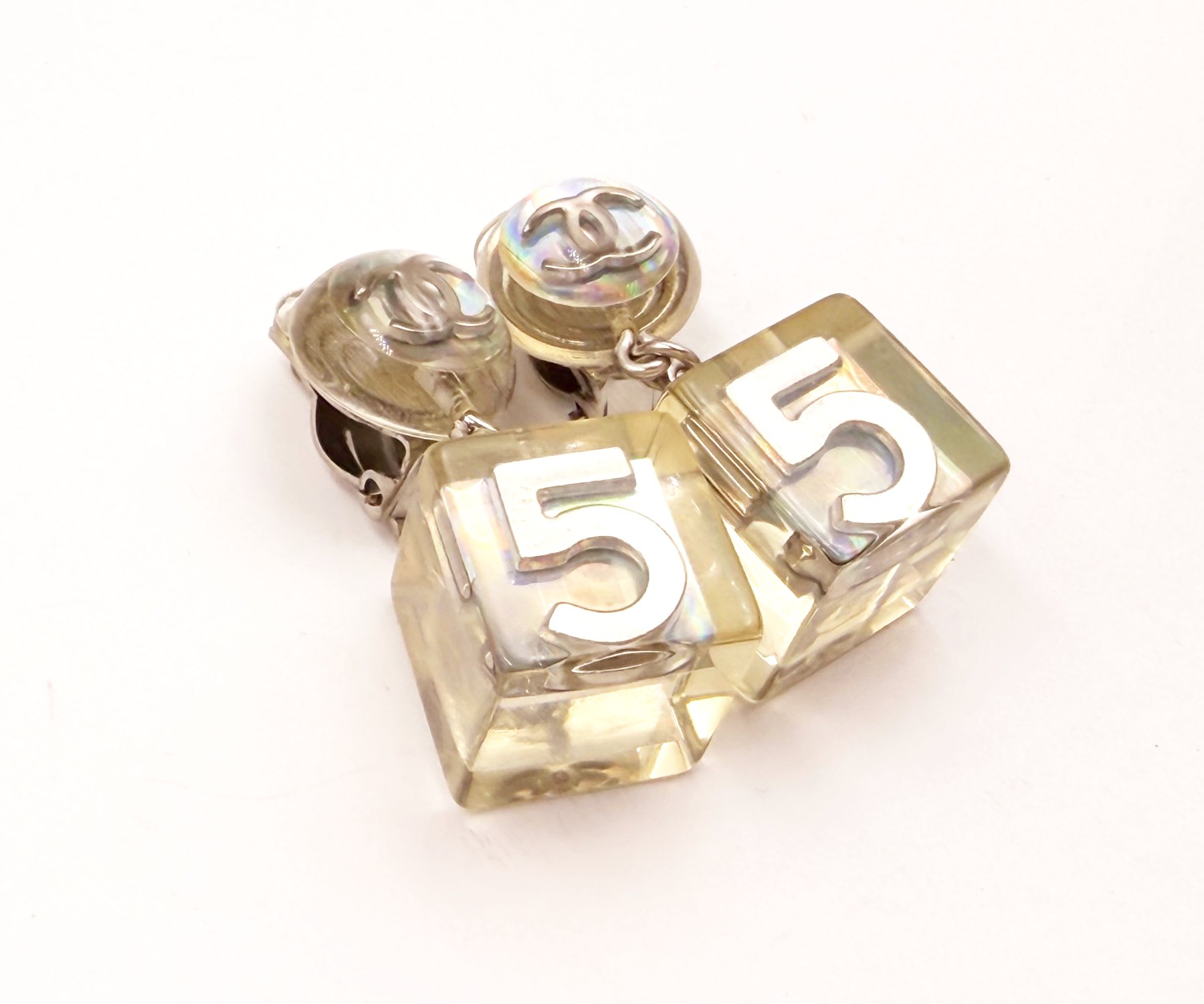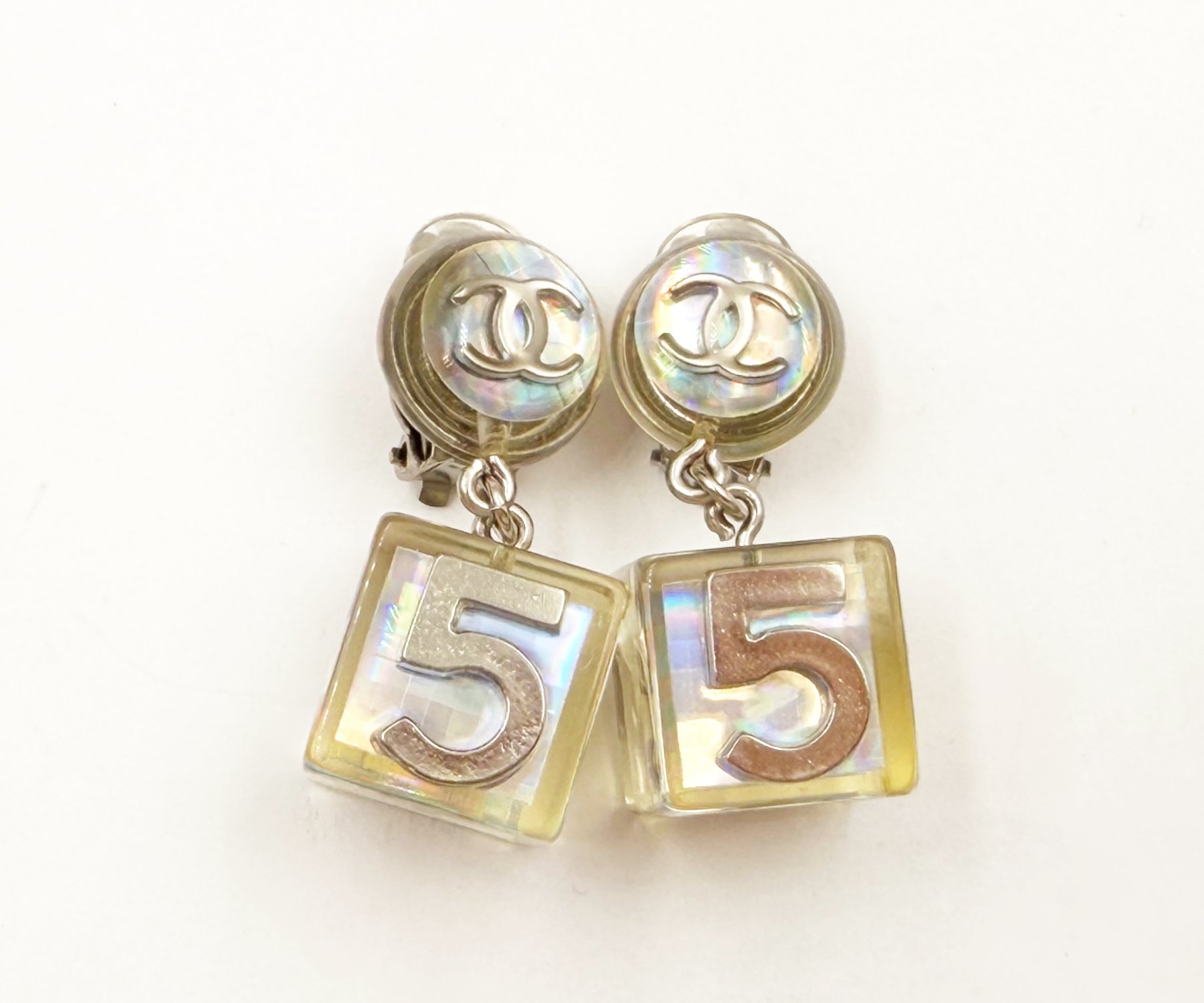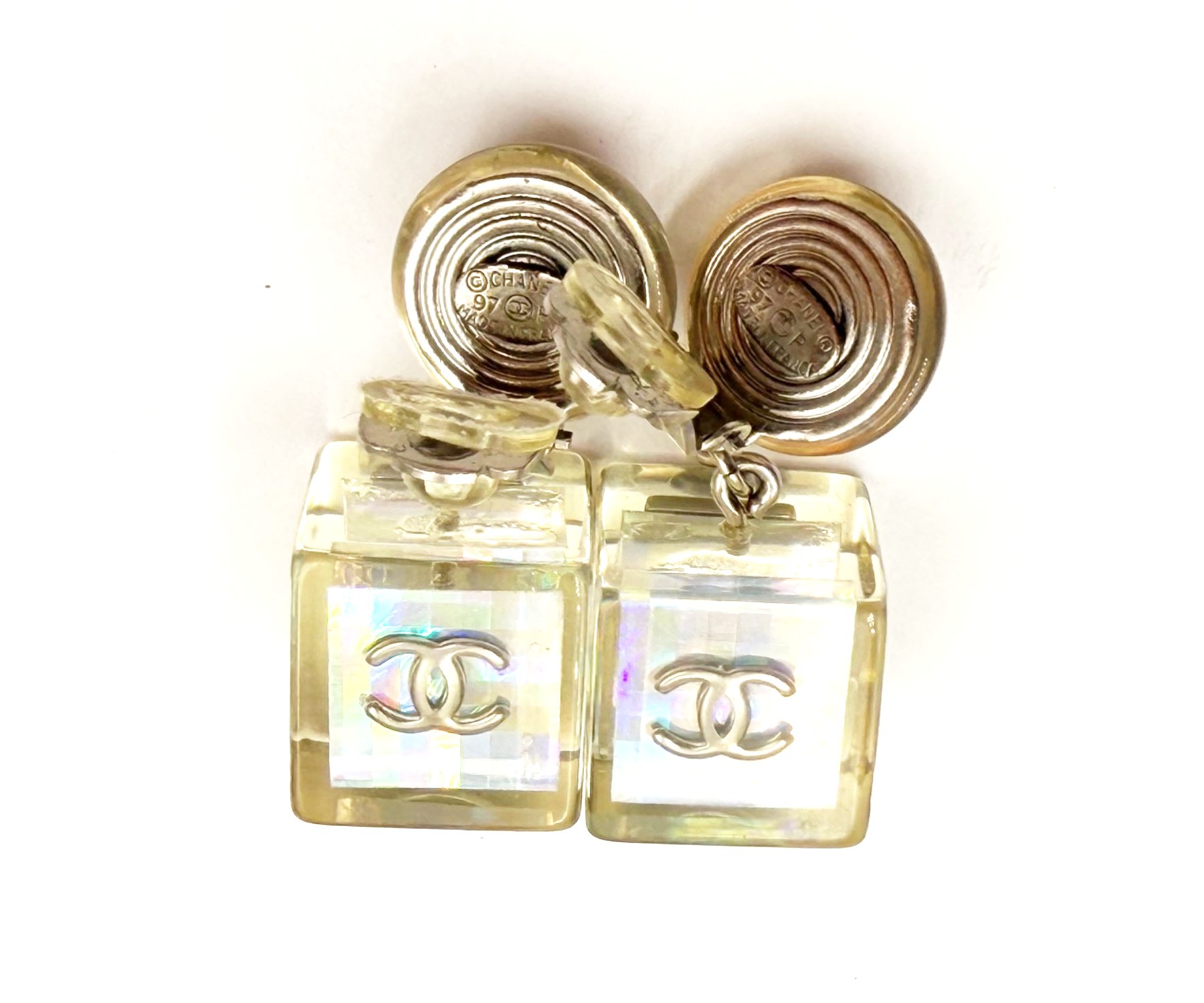 Chanel Vintage Silver CC Iridescent Dice 5 Dangle Clip on Earrings