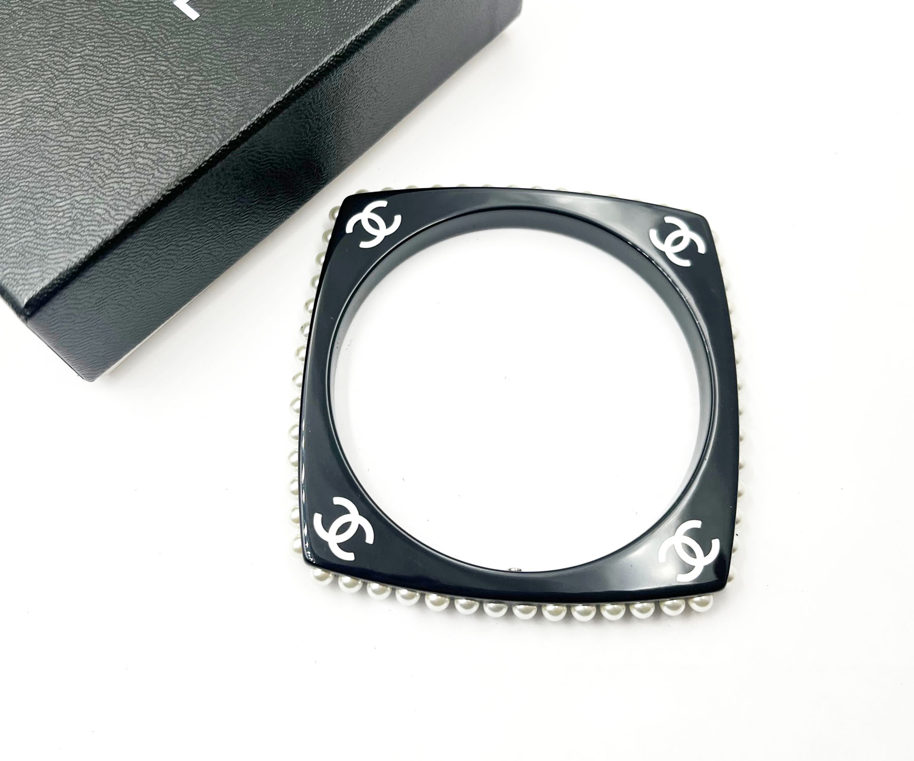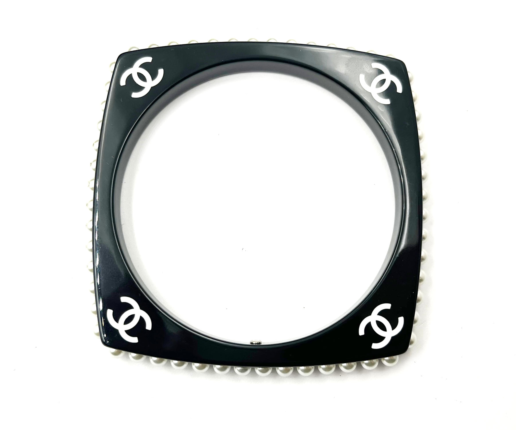 Chanel White CC Black Resin Pearl Edge Bangle Bracelet