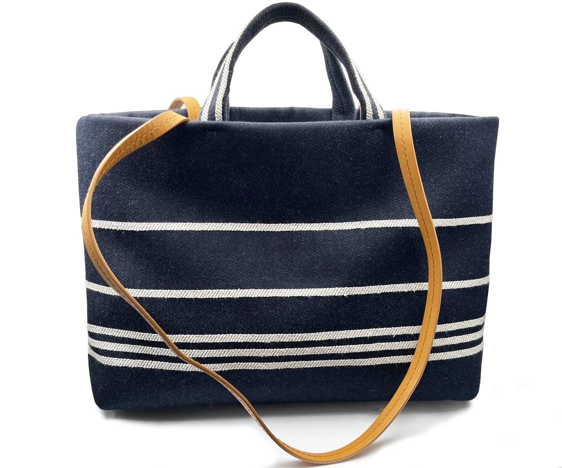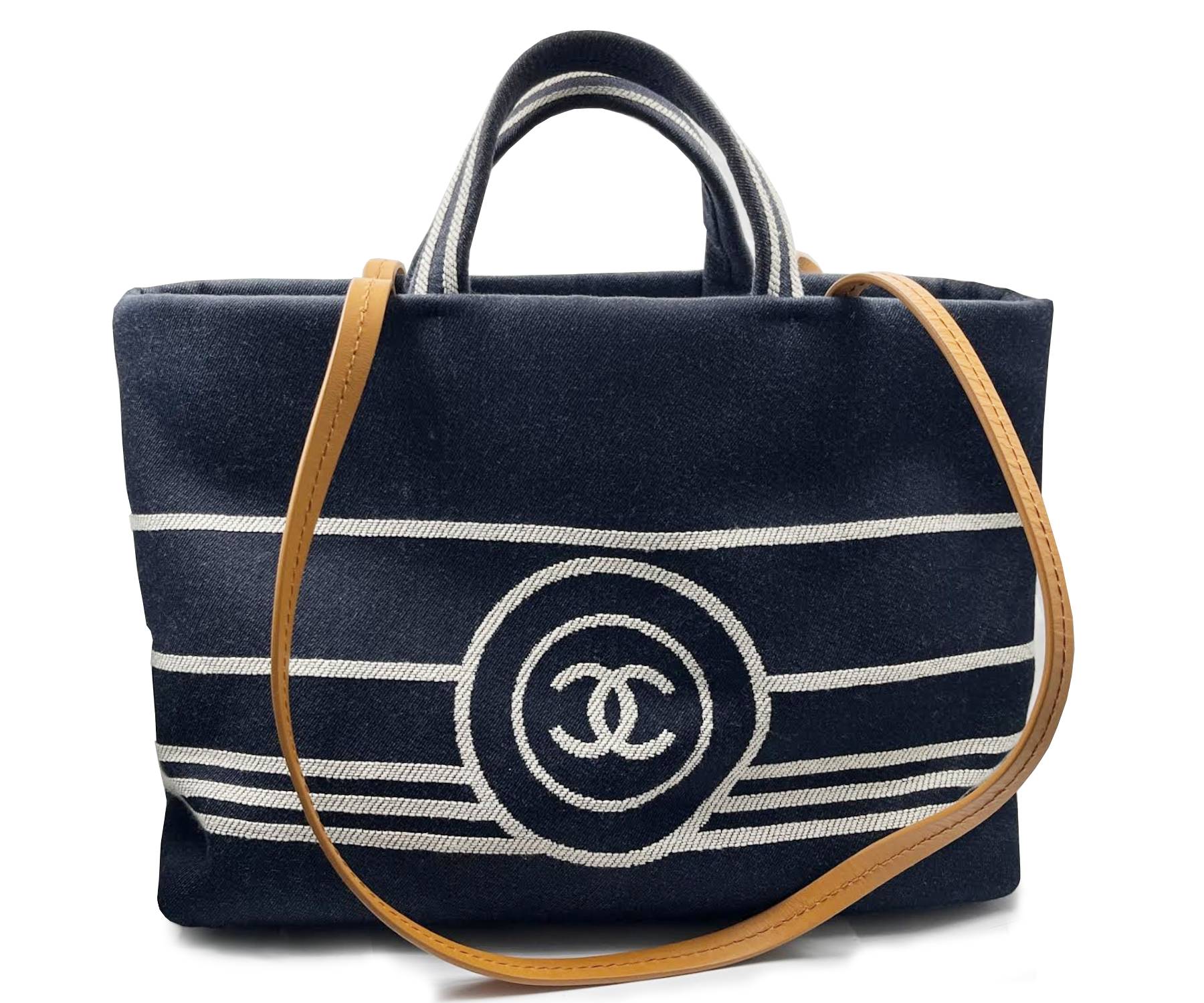 Chanel White Stripe CC Denim Leather Strap Tote