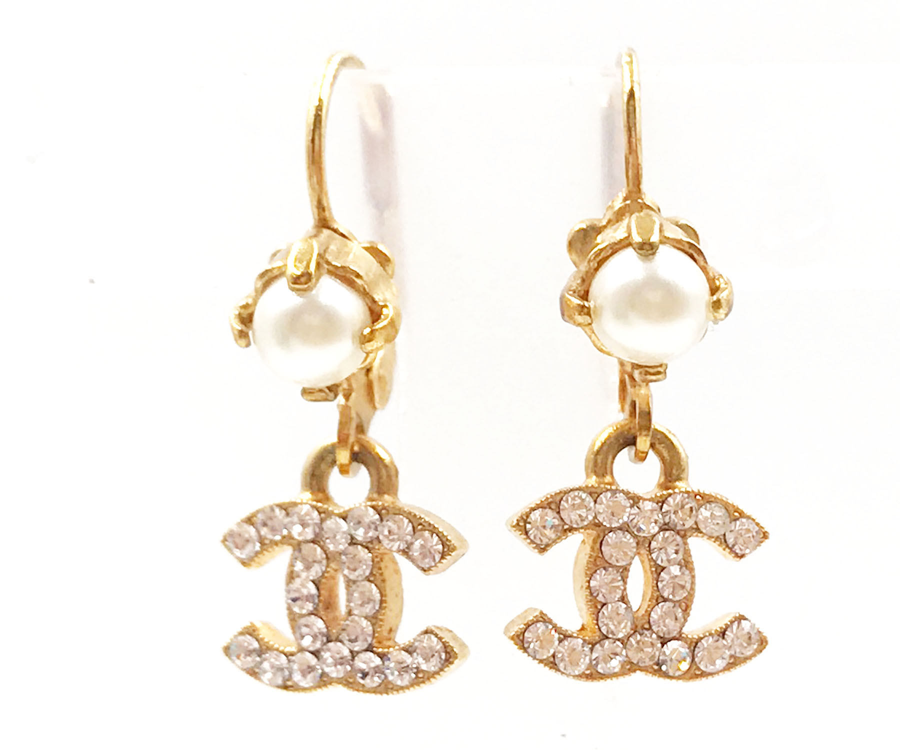 16. Chanel Gold Plated Faux Pearl CC Crystal Dangle Lever Earrings/ AB1082-00237