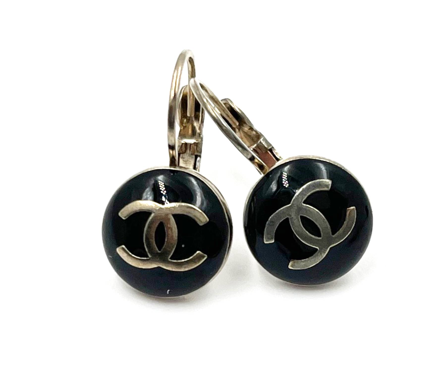 12. Chanel Silver CC Black Round Button Lever Back Earrings/ AB1047-00234