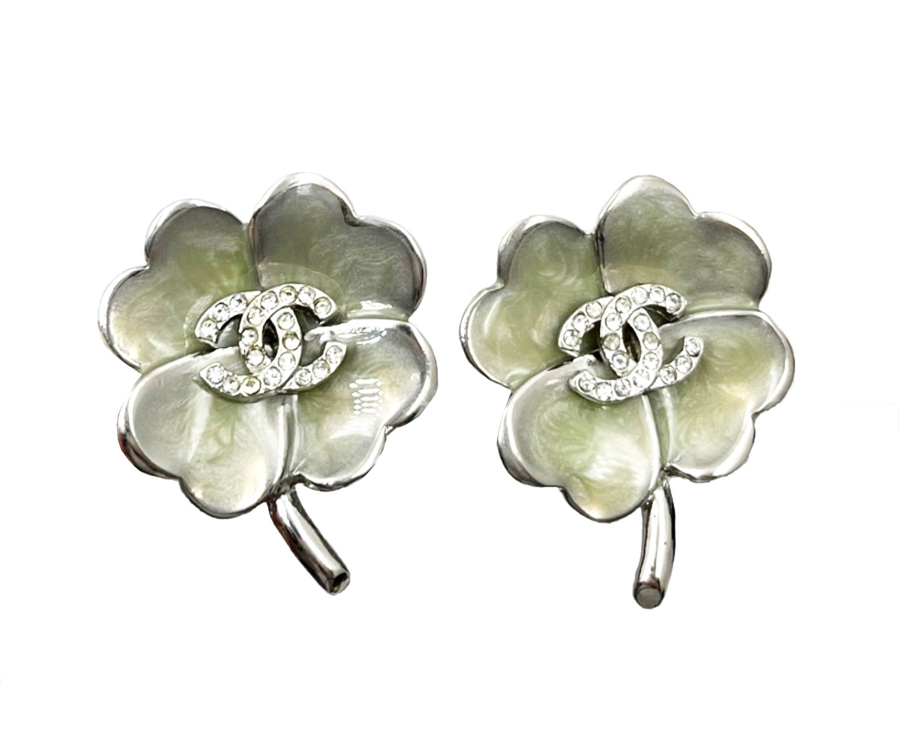 9. Chanel Silver CC Crystal Mint Enamel Clover Clip on Earrings/ AB3014-02232